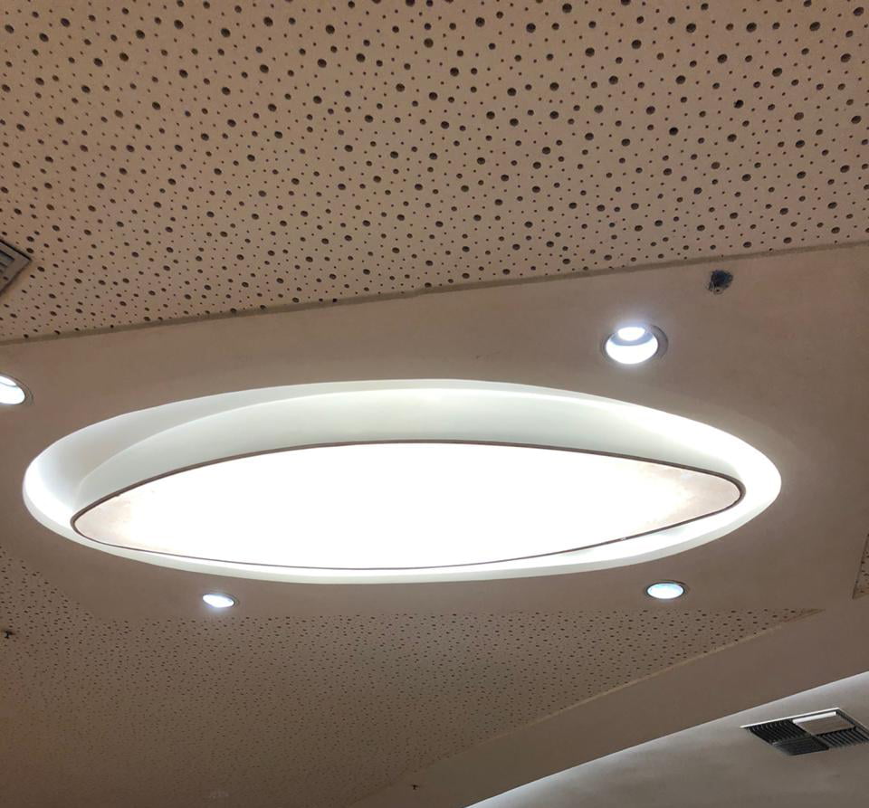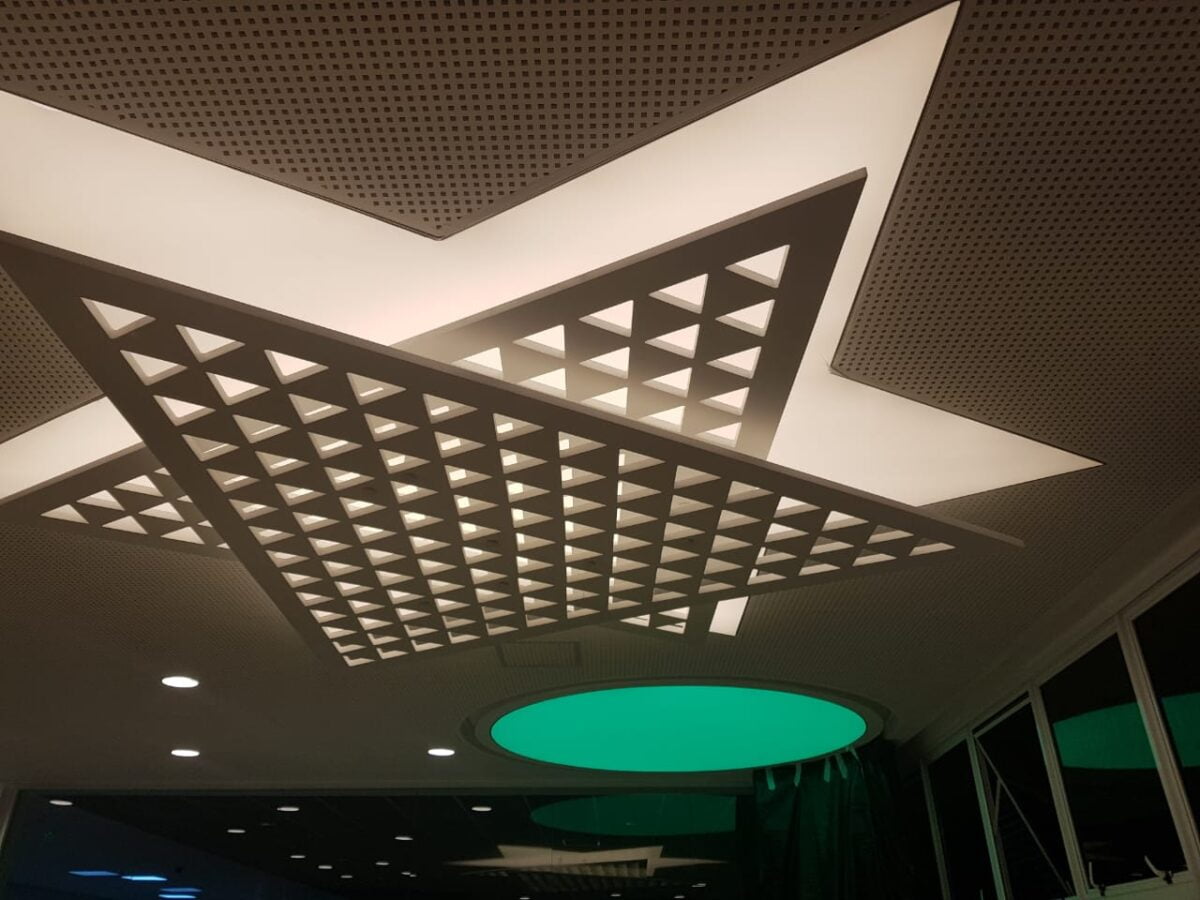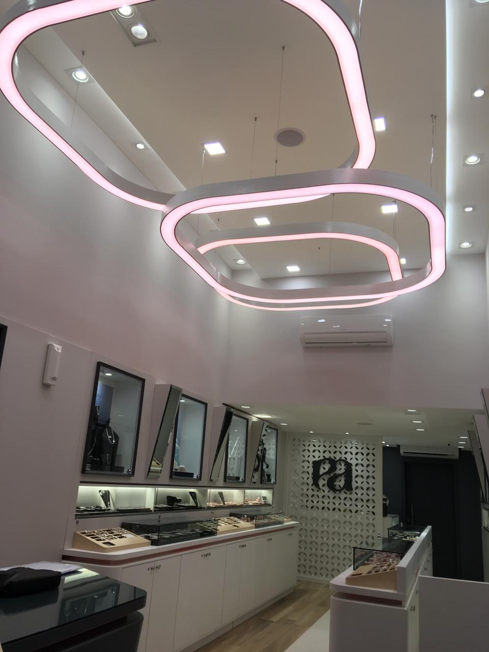 Pendant Luminaires formed by circular structures produced with Tensoflex aluminum profile, electrostatic painting, translucent films and perimetral LED strips.